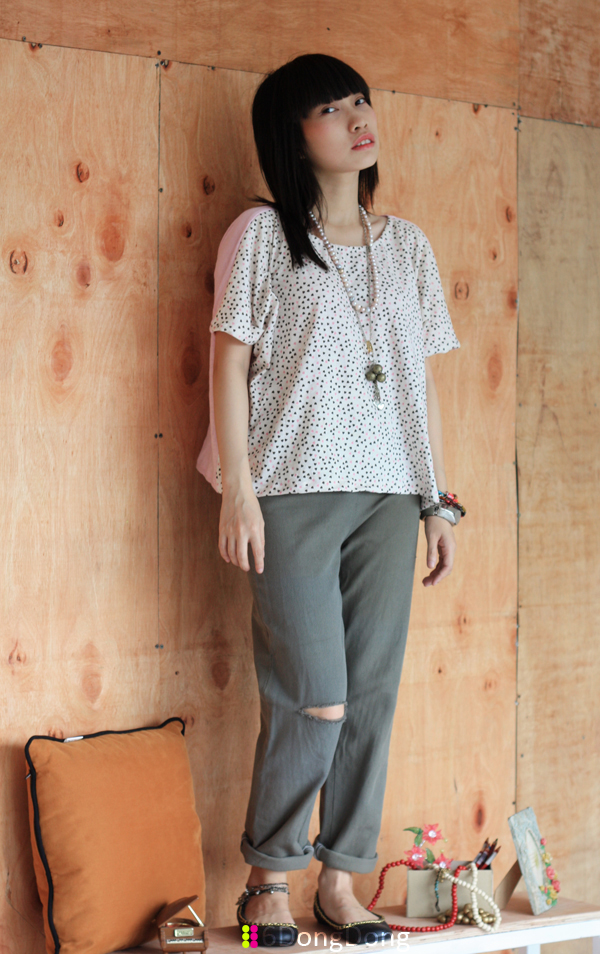 Ngày: Quần lưng cao, ống đứng, cắt rách gối, mình thấy rất phù hợp hội họp không mang tính chất giải trí, thêm vào vòng cổ hạt trai đổ đống nhưng nhìn đứng đắn hẳn cái sự luộm thuộm của kiểu phối này.