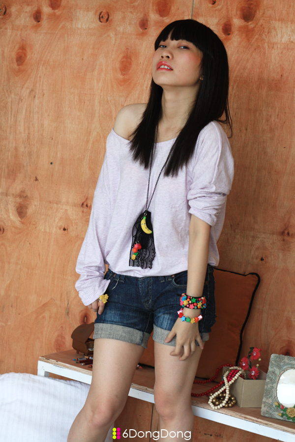 Tiếp tục ở dơ có nghệ thuật từ sáng đến tối. Bản thân chỉ thích một số thứ, nên không phải là mua cái mới, căn bản là mình tìm cách làm mới cái mình thích là được. Cái áo sọc tay dài, hở vai này để không thì treo bảng “bao chán” luôn. Nhìn rất buồn! Công thức đơn giản: