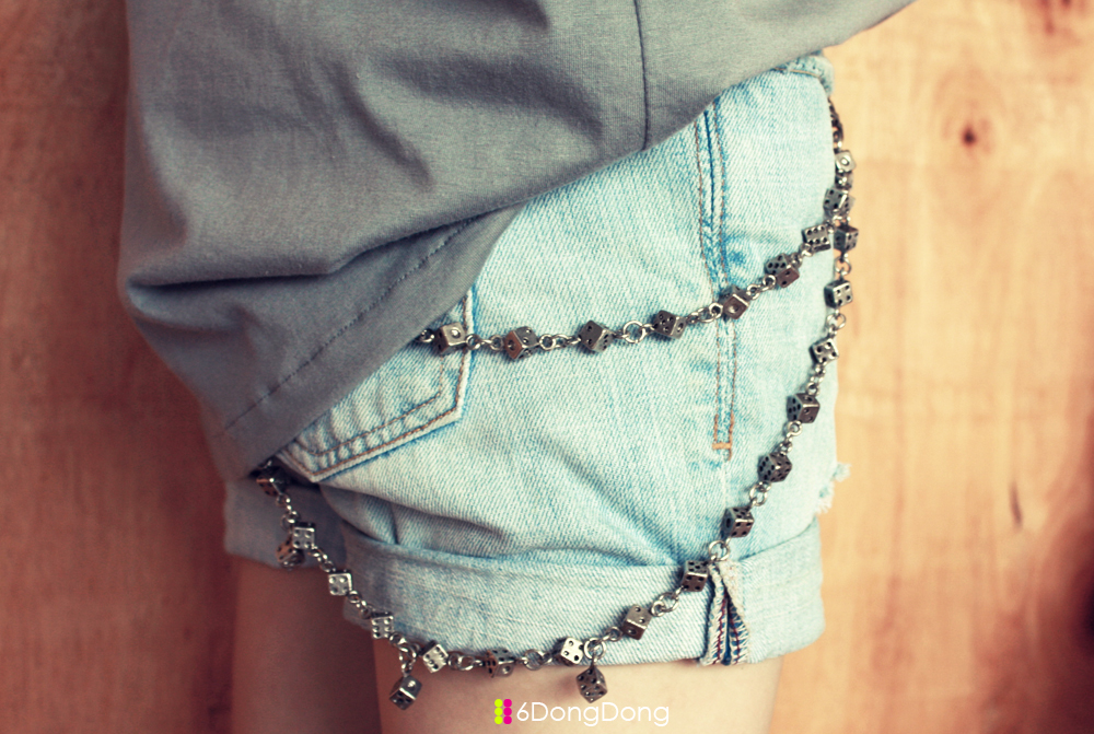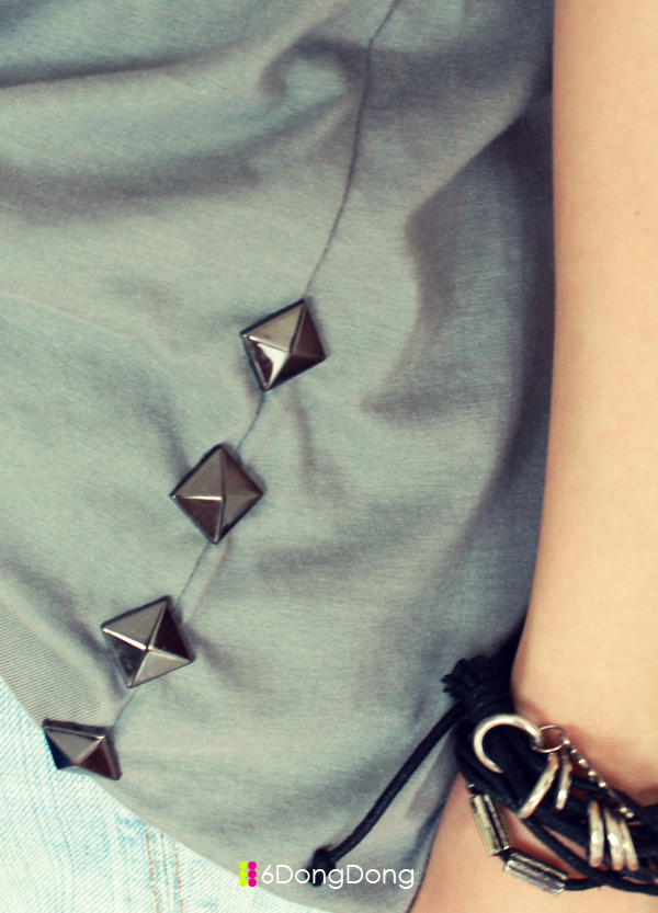 … bằng cách dùng đinh bẹt đính linh tinh lên tay và sườn áo. Cộng thêm quần soóc jeans và một vài phụ kiện hầm hố – hoàn tất phong cách yêu thích của El, hị hị :”>