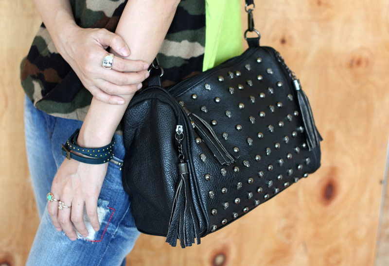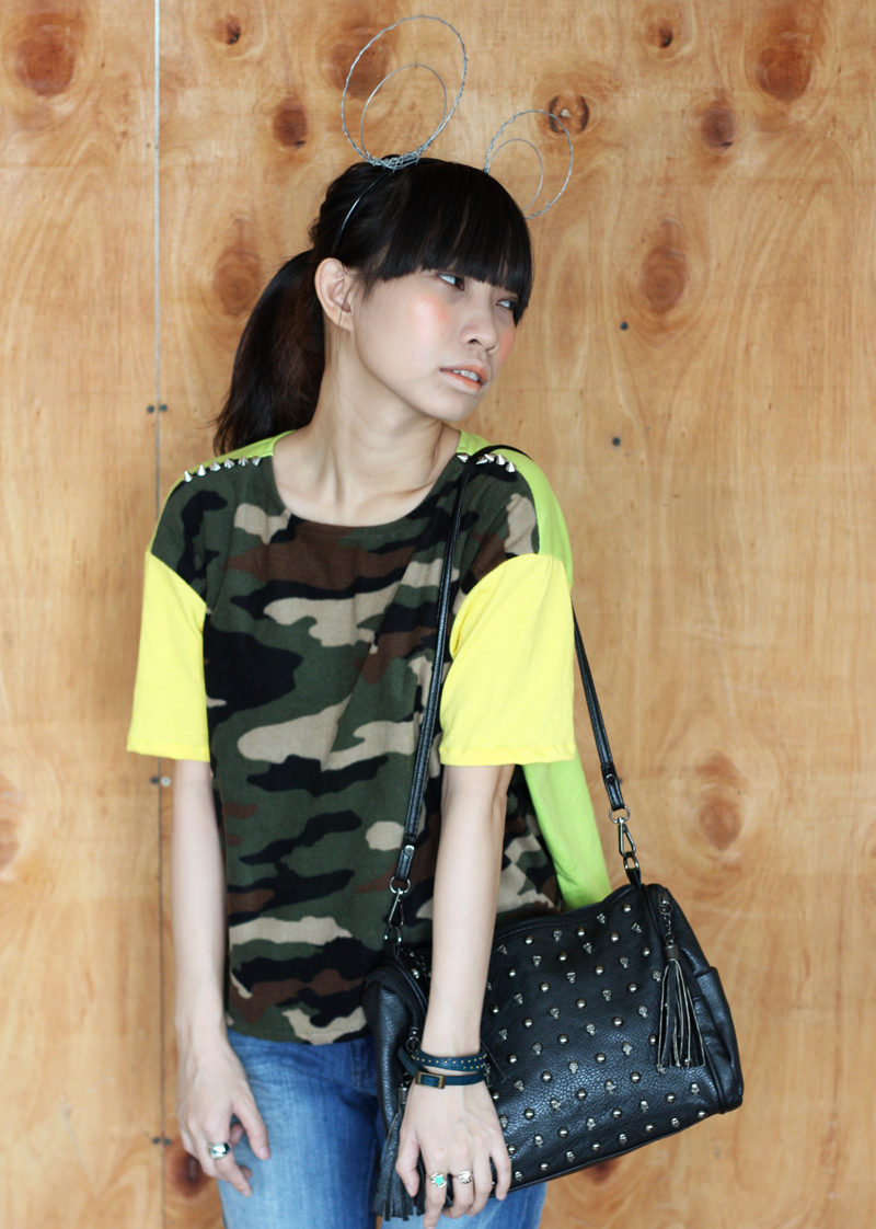 6dongdong camo croptop | gifted bracelets & bag | Kstyle rings | Ninomaxx jeans | Steve Madden sneakers