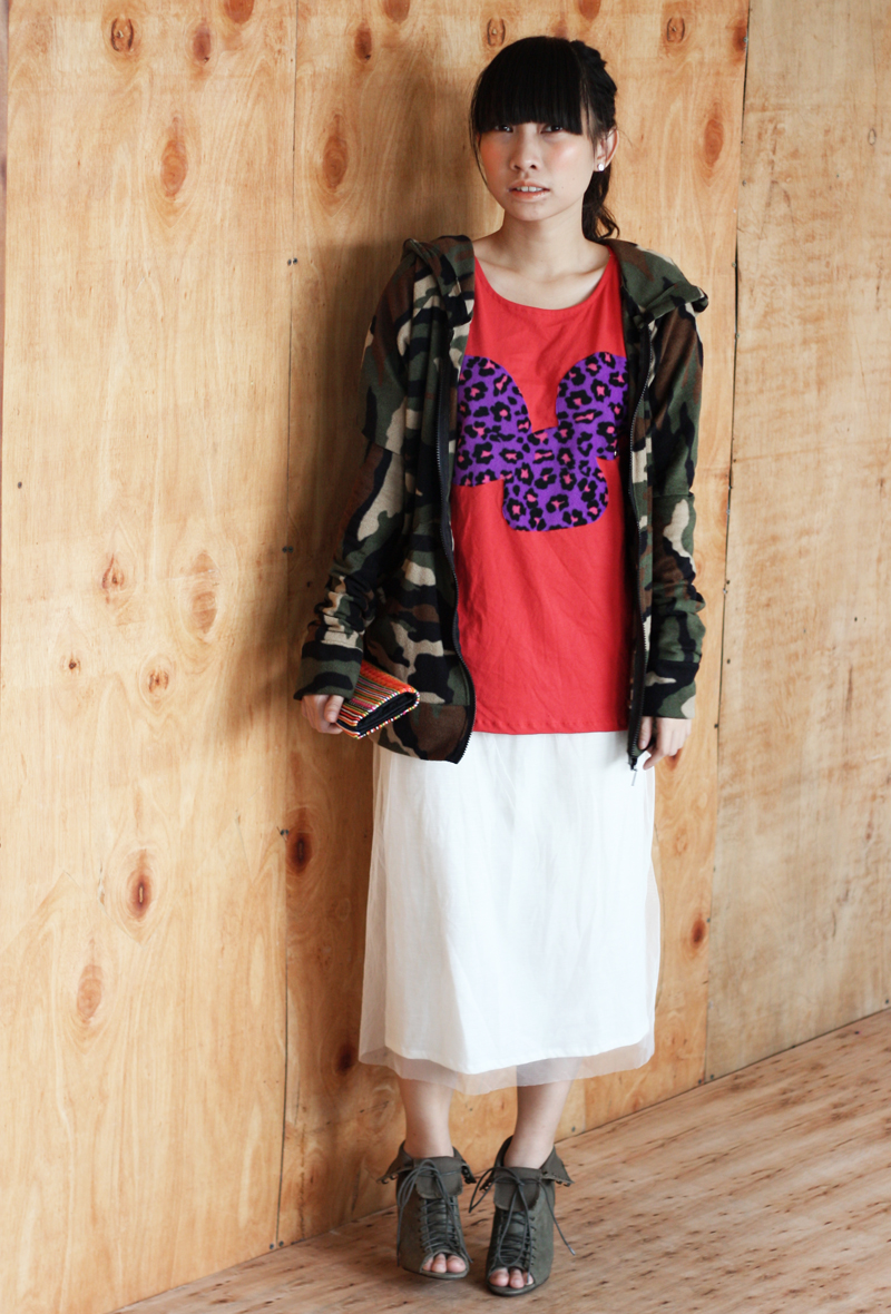 Mitte Tee + White layered midi skirt + ALDO peep toe boots + Camo hoodie + Tribal wallet