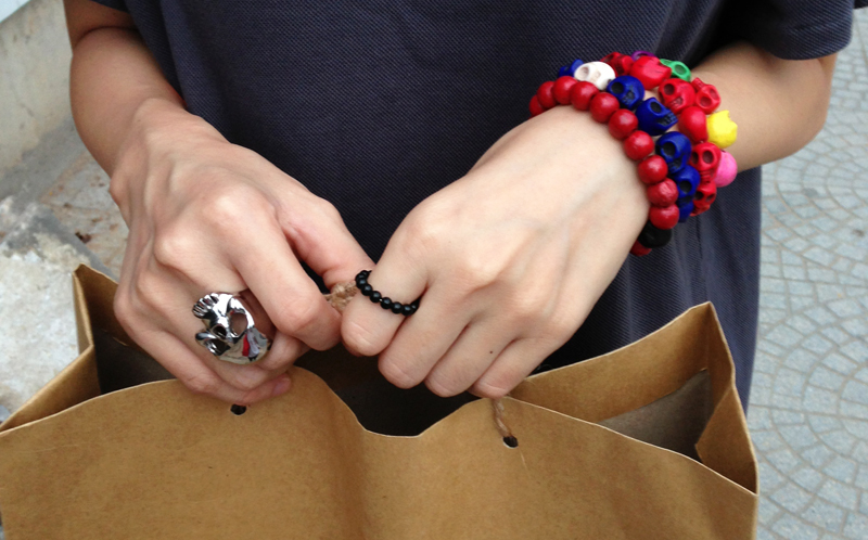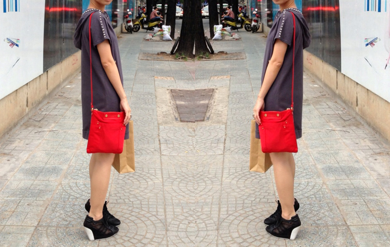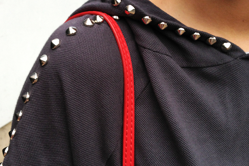 6dongdong studded hoodie & bracelets | Marc by Marc Jacobs red bag |