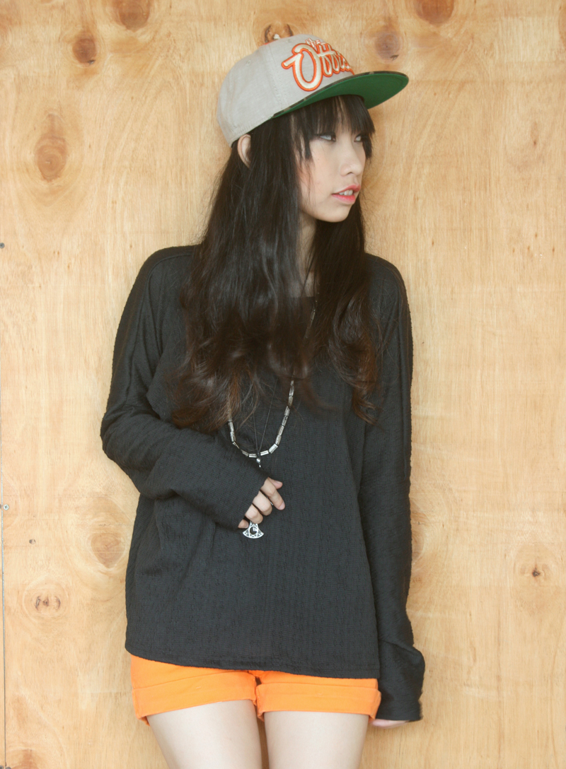 Lần này là quần soọc cam và bốt đen, vài cái xích cổ, kẻ mắt và đánh môi đỏ,