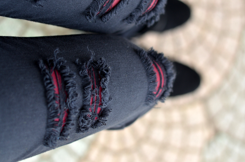 Quần jeans rách nên mặc tất da màu đỏ đô, mỗi lúc ngồi xuống thấy lấp ló cũng vui.