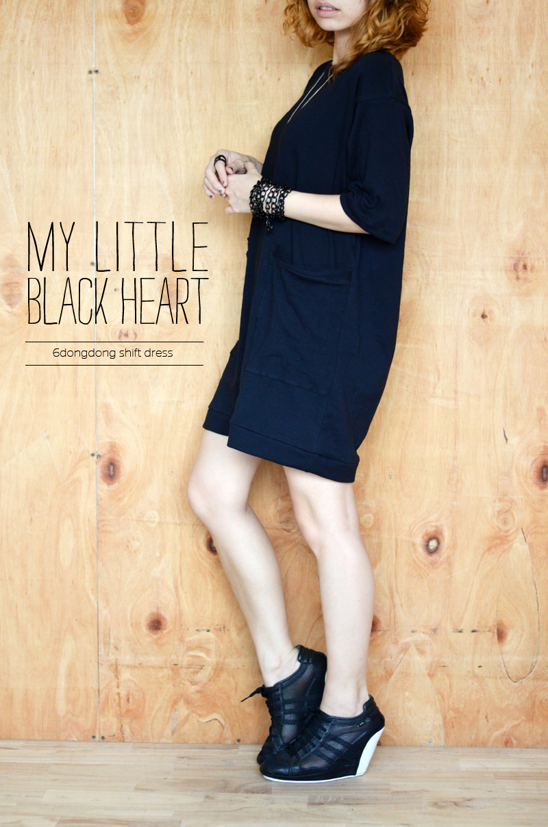 6dongdong Black Heart shift dress & Black Out sweatshirt (wrap around) | Adidas SLVR shoes | Forever21 necklace|