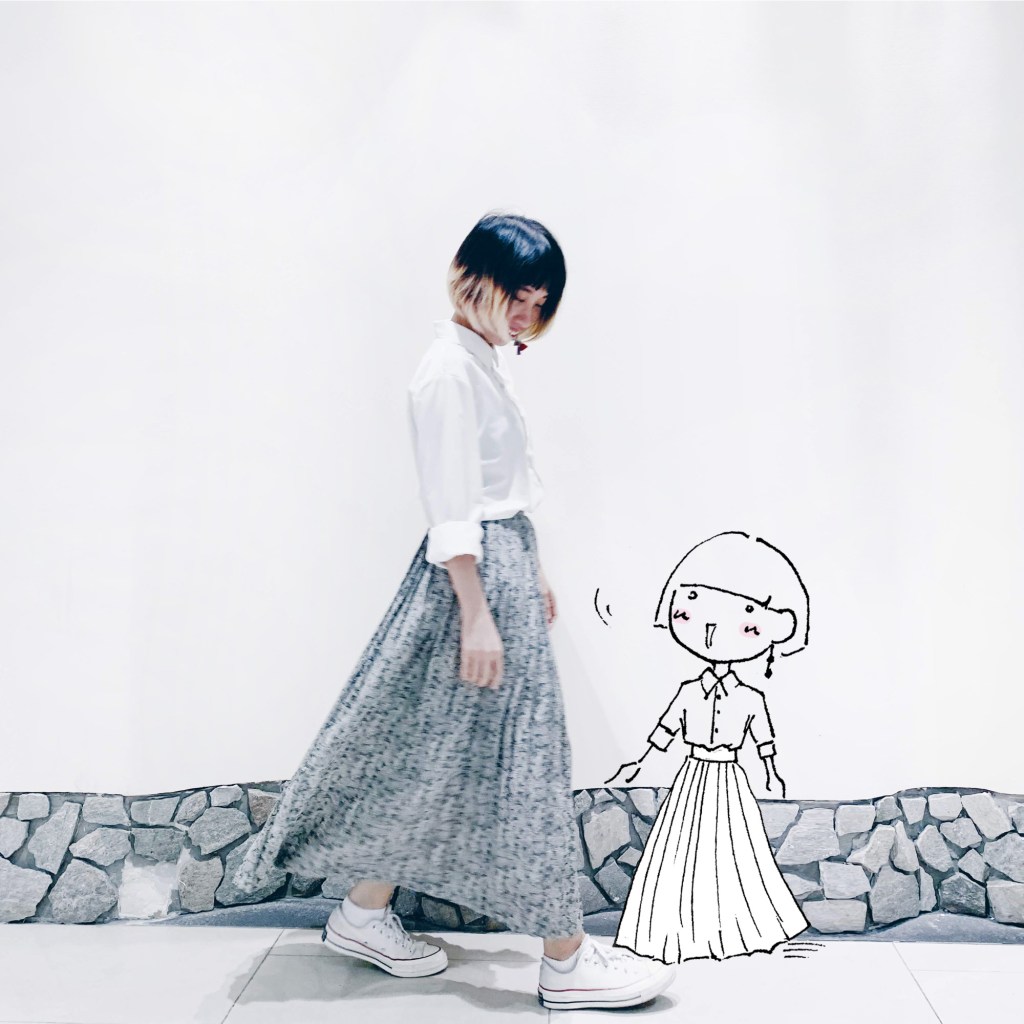 Pairing a very formal shirt – which makes me look like going to a job interview with a vintage pleated skirt – which I thrifted in Bangkok. And yes always tone down everything with sneakers.